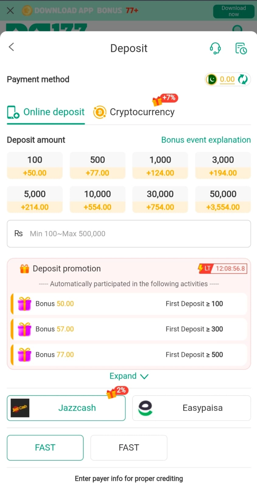 - Choose Easypaisa as your deposit option.